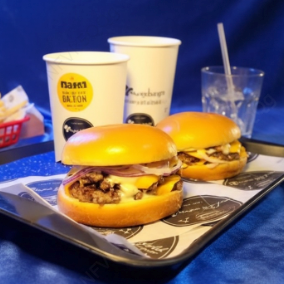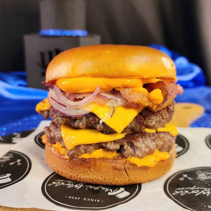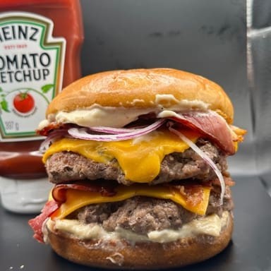 Pão de brioche, 2 carnes de 150 gramas , Cheddar fatiado ,Molho cheddar, Cebola Roxa e Bacom fatiado