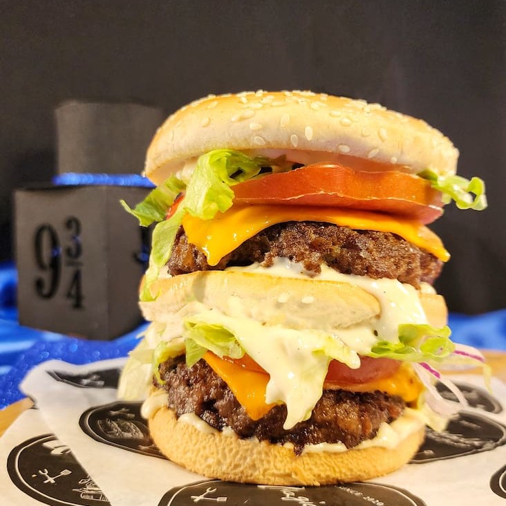Pão supremo , 2 carnes de 150 gramas , Molho Magic , Queijo Cheddar Fatiado , Alface americano , Tomate e Cebola Roxa