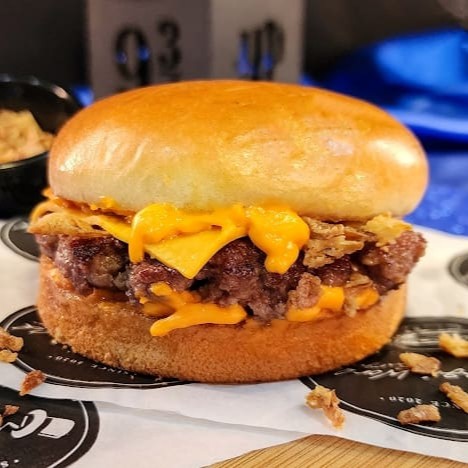 Pão de brioche, Carne de 150 gramas , Molho cheddar , Cheddar Fatiado e Cebola Crispy