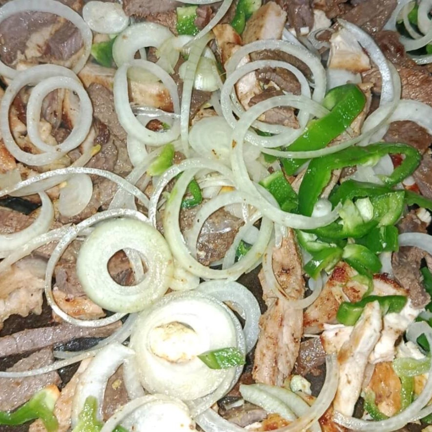1 Kilo de mistura em churrasco,filé de frango,carne,linguiça e pernil,com pimentão,cebola e coentro.