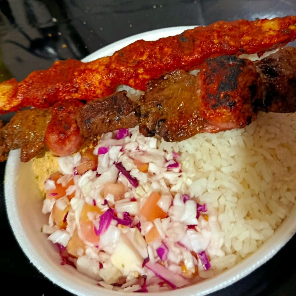 10 Espetinhos variados,linguiça,misto(carne e linguiça),Carne e queijo(Cada espetinho,aproximadamente 110 gramas).Acompanha salada de vinagrete de repolho com tomate e farofa.1 Refrigerante de 2 litros(oq estiver disponível).
