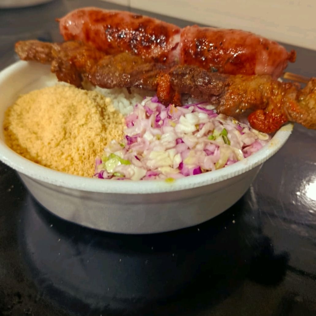 Marmitex Grande, aproximadamente 1 kilo de Baião de 2,com carne seca,linguiça calabresa,bacon, coentro,queijo e 4 espetos doq estiver no momento.