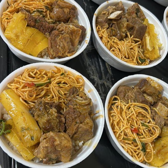 Marmita Grande aproximadamente 900 gramas,acompanhada de Arroz branco,Feijão,macarrão,Costela cozida com mandioca cozida,(Não acompanha salada,é a parte).