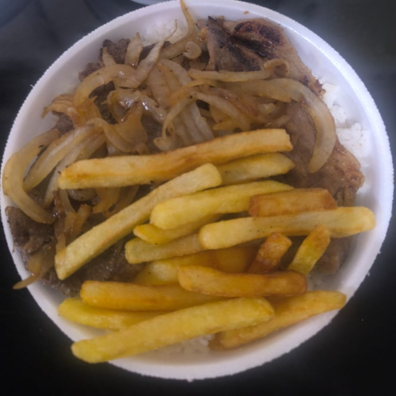 Marmitex Media,com aproximadamente 500 gramas,só dá mistura,Bife acebolado.