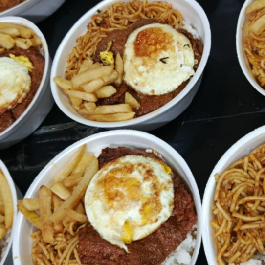 Marmita Media,aproximadamente 700 gramas,acompanhada de Arroz branco,Feijão,macarrão,o bife com ovo,batatas fritas ou pure de batata,(Não acompanha salada,é a parte).
