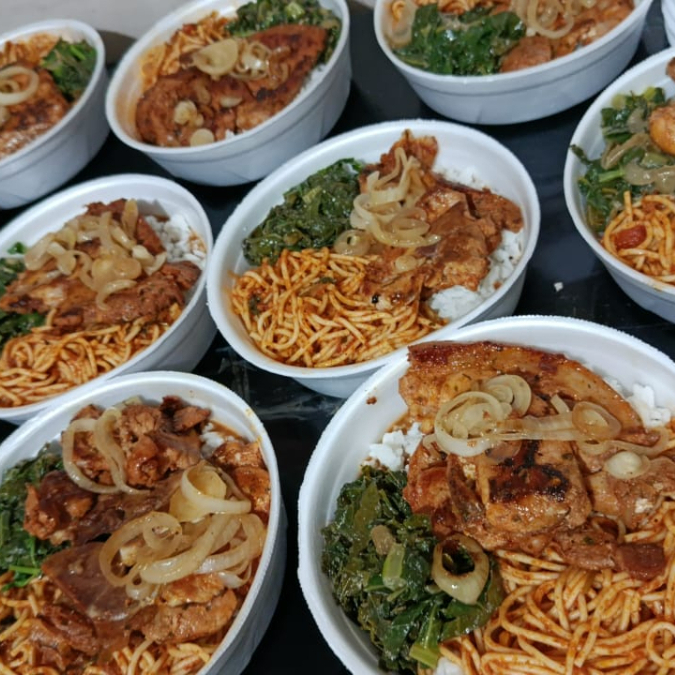 Marmita Grande,aproximadamente 900 gramas,acompanhada de Arroz branco,Feijão,Macarrão, bisteca,batatas fritas ou pure de batata,(Não acompanha salada,é a parte).