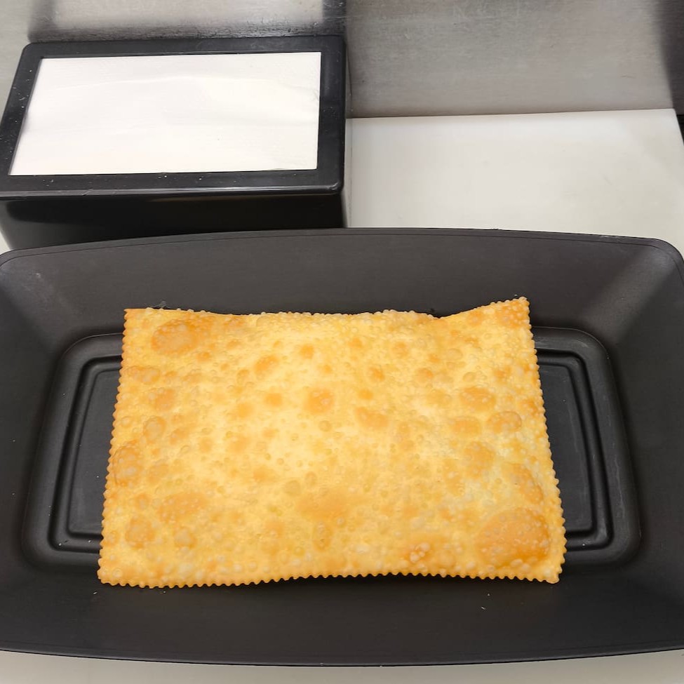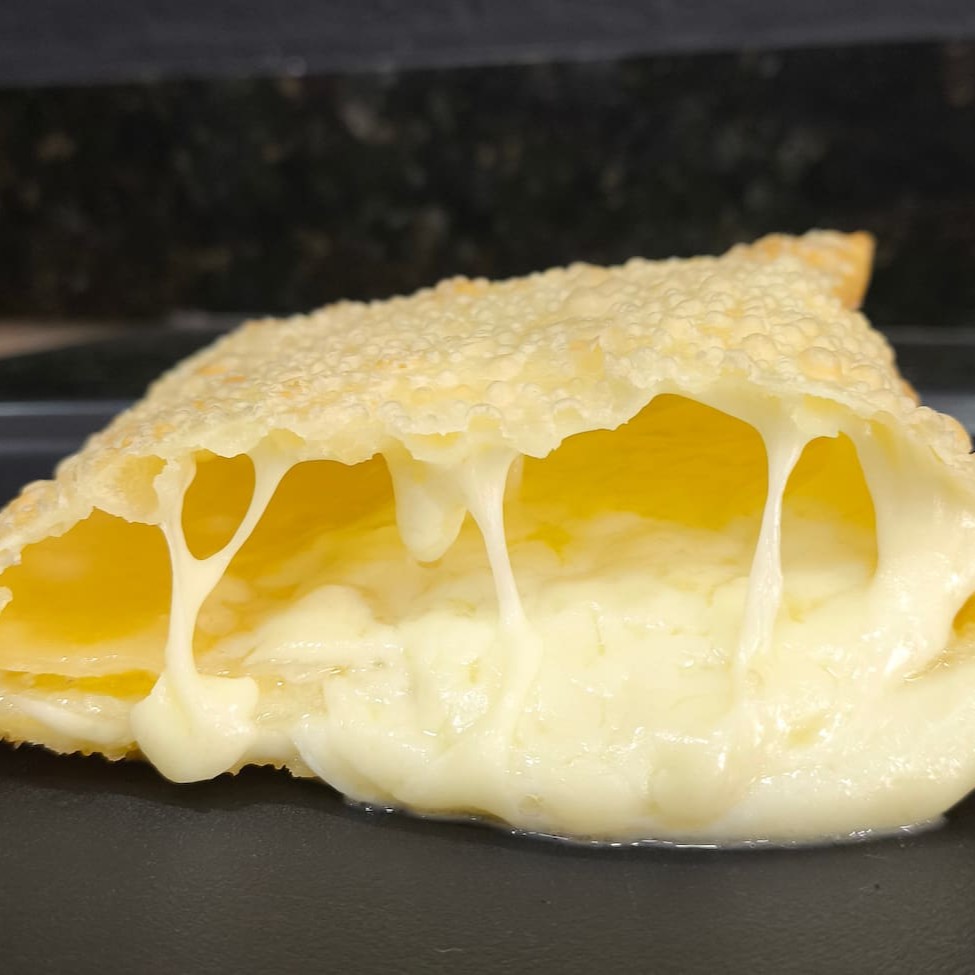 Pastel recheado com queijo mussarela. Pastel sequinho, montado e frito na hora. Tamanho tradicional aprox. 23 cm.