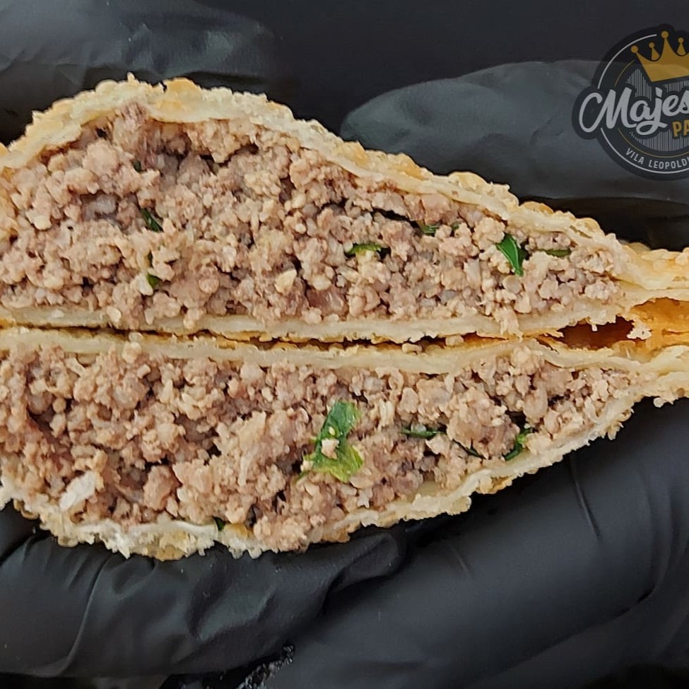 Pastel recheado com carne moída, alho torrado, mussarela e ovo. Pastel sequinho, montado e frito na hora. Tamanho tradicional aprox. 23 cm.