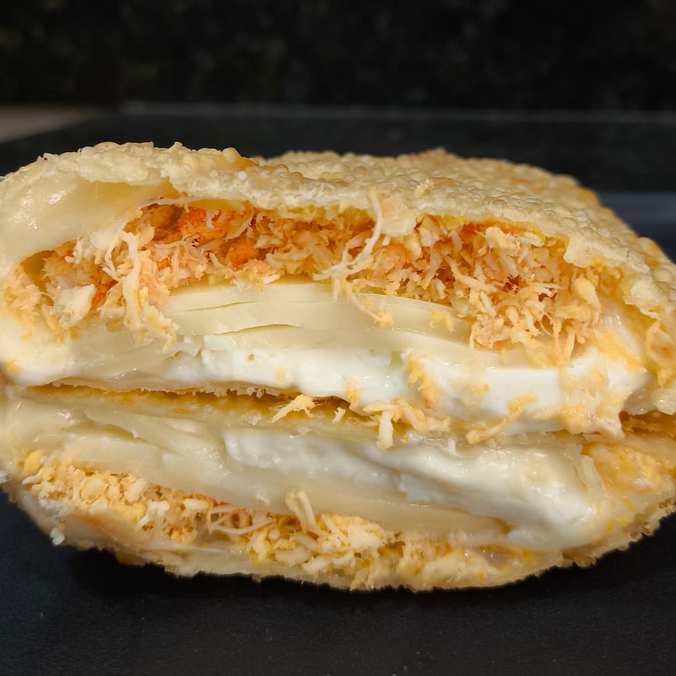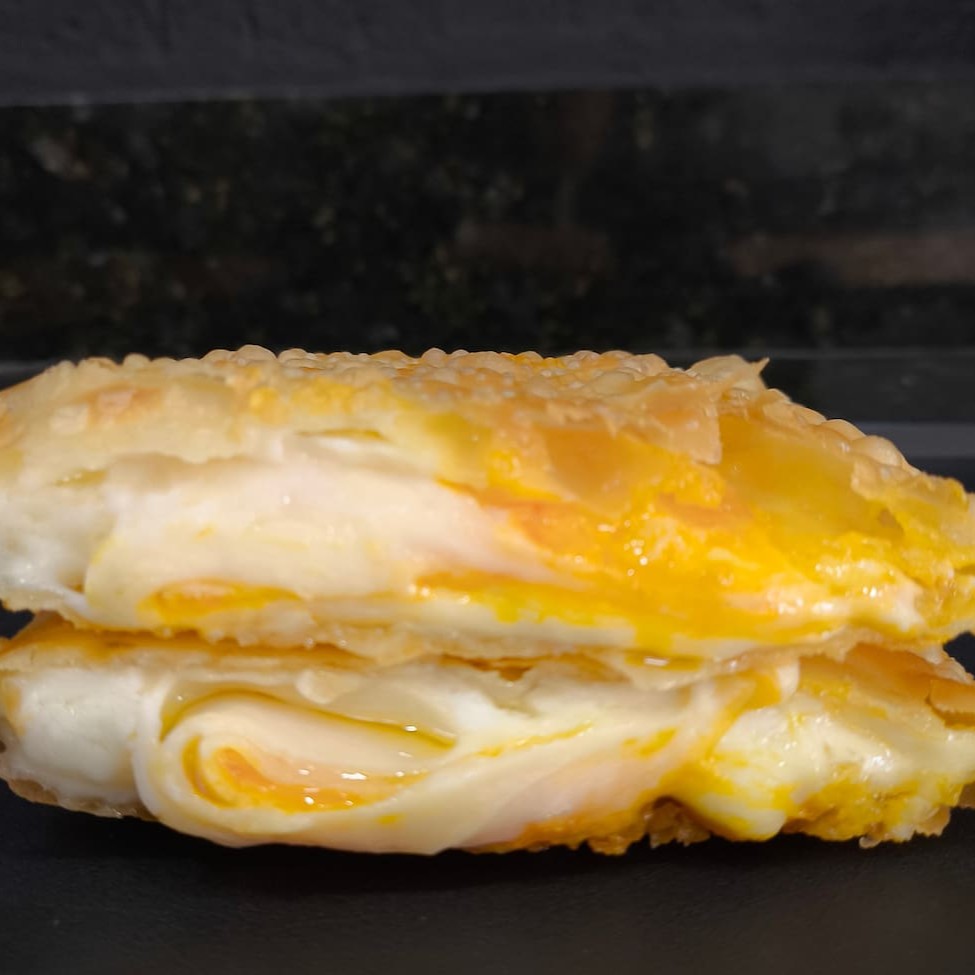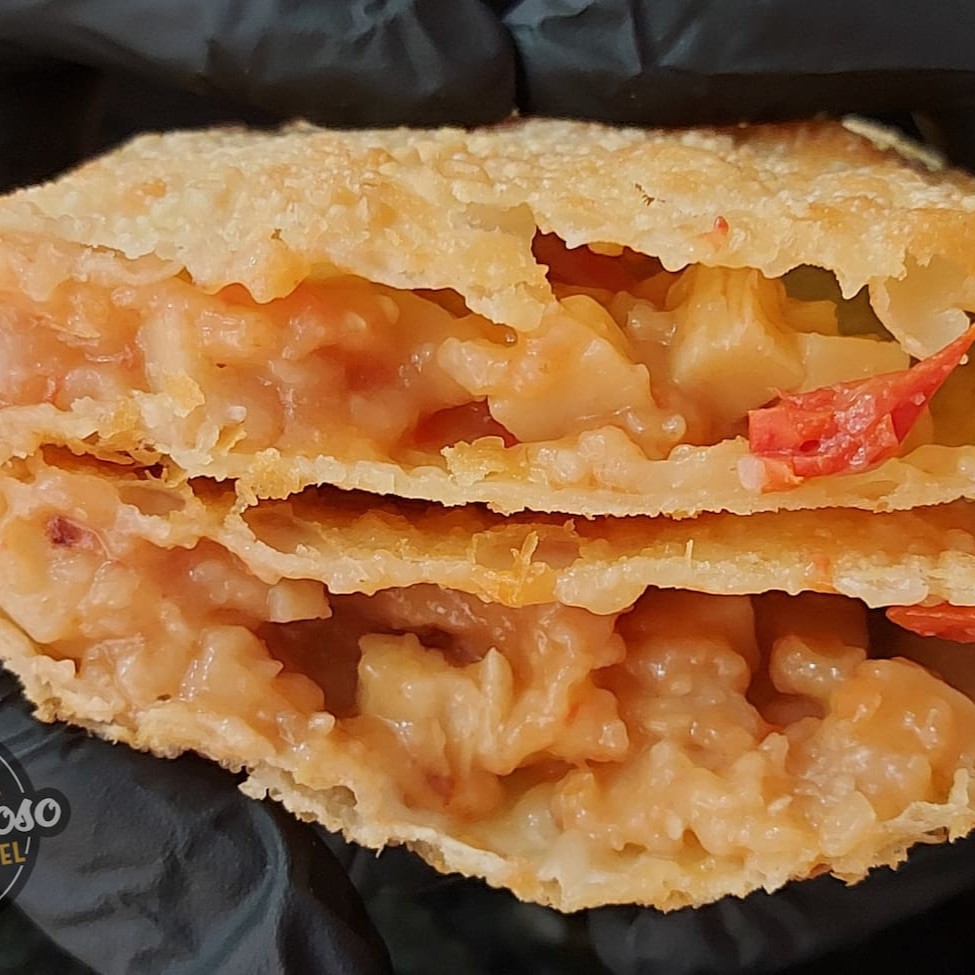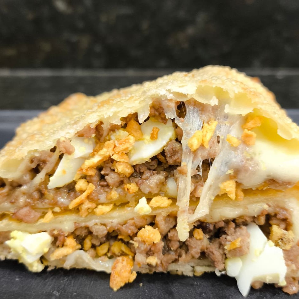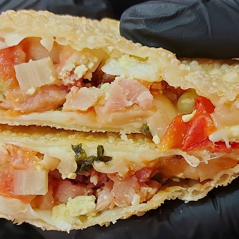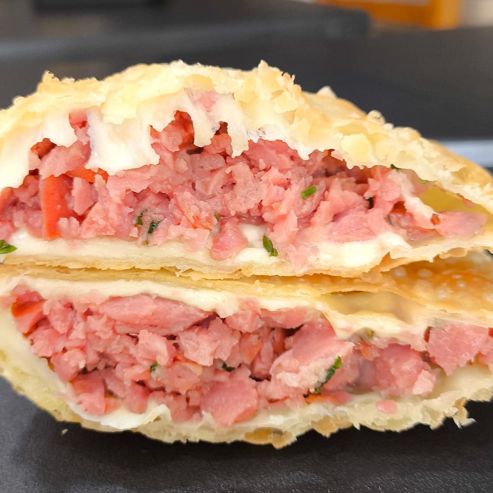 Pastel especial recheado com 10 recheios, carne moída, bacon, calabresa, salame, mussarela, provolone, cheddar, Catupiry, milho e ovo. Pastel sequinho, montado e frito na hora. Aproximadamente 500 gr. #pastel