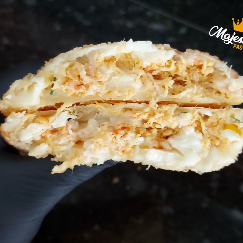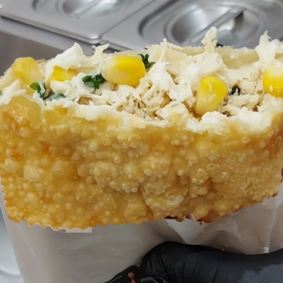 Pastel de frango, ovo, mussarela, milho e Catupiry Original. Pastel sequinho, montado e frito na hora. Tamanho aproximado de 23 cm.