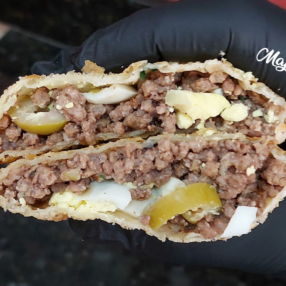 Pastel recheado com carne, ovo e azeitonas fatiadas. Pastel sequinho, montado e frito na hora. Tamanho aproximado de 23 cm.