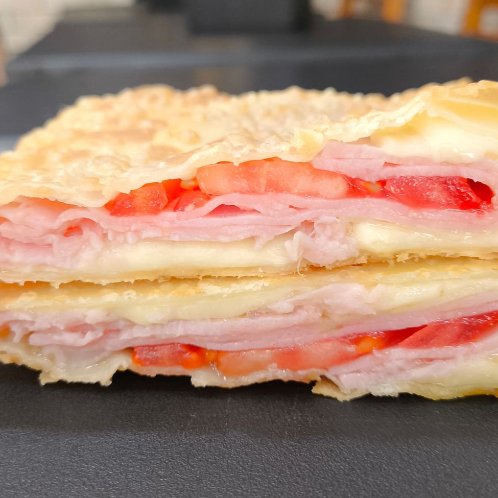 Pastel recheado com queijo mussarela, presunto e tomate. Pastel sequinho, montado e frito na hora. Tamanho aproximado de 23 cm.