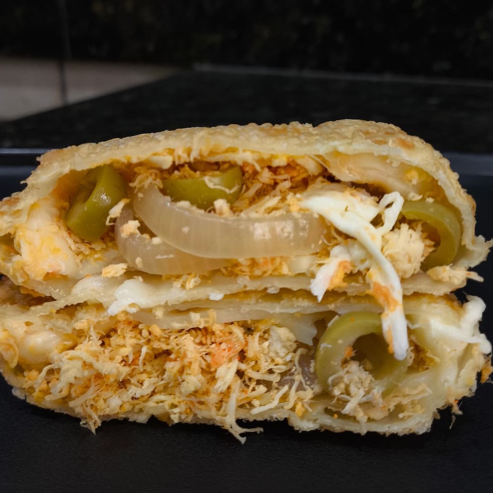 Pastel recheado com frango, mussarela, provolone, cebola e azeitonas. Pastel sequinho, montado e frito na hora. Tamanho tradicional aprox. 23 cm.