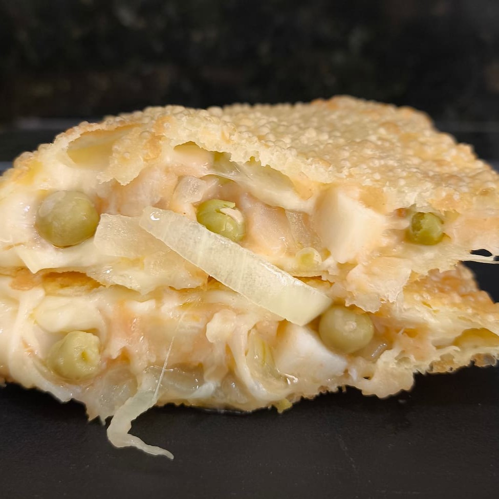 Pastel recheado com bacon, champignon, mussarela, palmito, ervilha e ovo. Tamanho tradicional aprox. 23 cm.