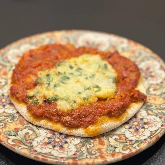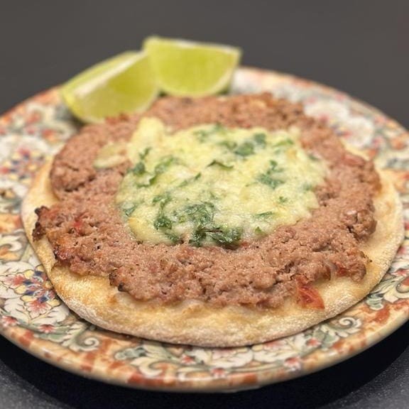 Esfiha recheada com intenso molho a base de pimentão vermelho, tomate, cebola e temperos sírios, coberto com queijo fresco. محمره مع جبنه