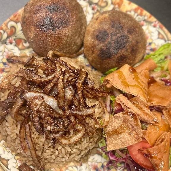 Kibes de carne assados NA BRASA (2 un). Acompanha arroz com lentilha (100g) e salada fatush. كبه مشويه