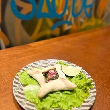 Esfiha recheada com pimentões, cebola, tomate, molho de tomate e temperos à moda síria. خضره