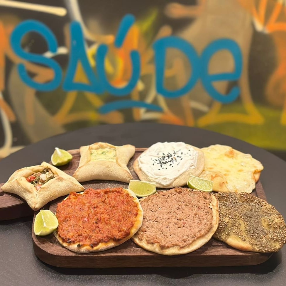 2 esfihas de carne, 2 esfihas de queijo, 1 esfiha de zaatar e 1 kibe frito.