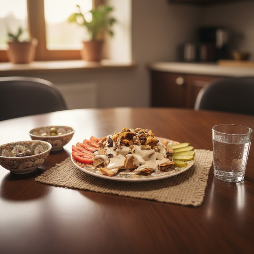 Arroz sírio e pão sírio torrado, molho de tahine com coalhada, coberto com tiras frango grelhadas na chapa e castanhas torradas na manteiga. Acompanha salada. فته شاورما