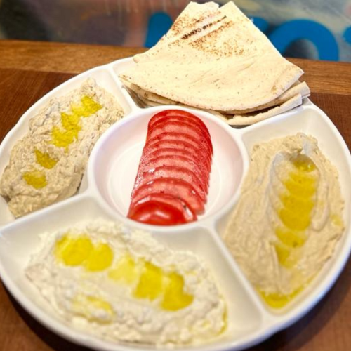 Pasta de homus (75g), babaganoush (75g) e coalhada seca (75g) acompanhados de pão sírio.