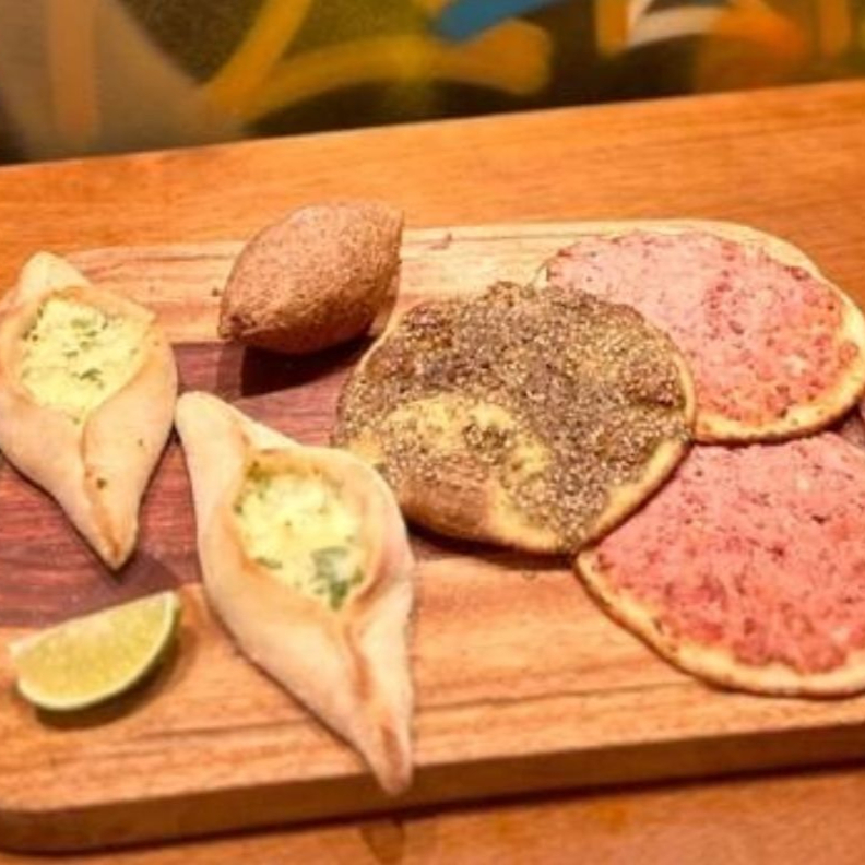 Kibe Cru (100g), Tabule (100g), Colhada Seca (100g) e Pão Sírio