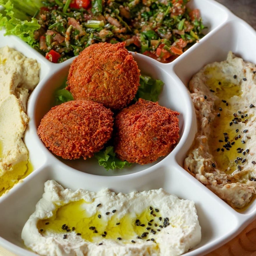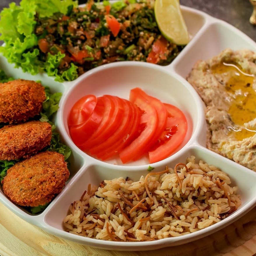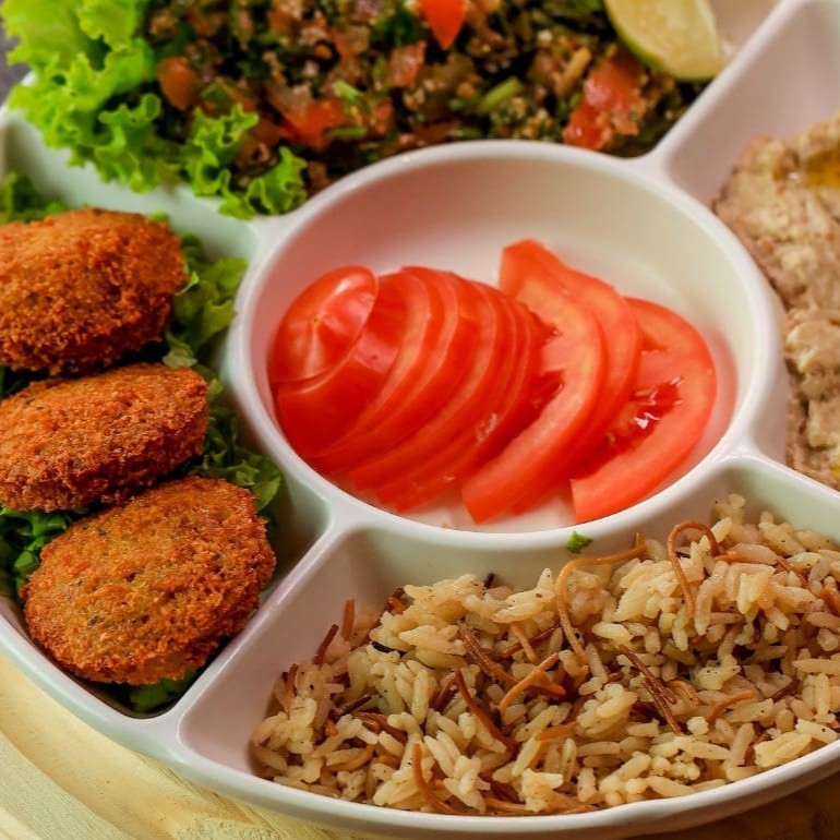 Bolinhos de falafel bem temperados, salada de fatush preparada na hora com folhas e legumes frescos e molho de româ, pasta de homus e arroz sírio