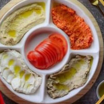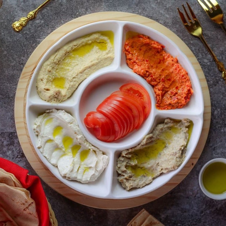 4 massas 150g cada (babaganush, coalhada seca, homos e mohamara)+ 2 pães sírios