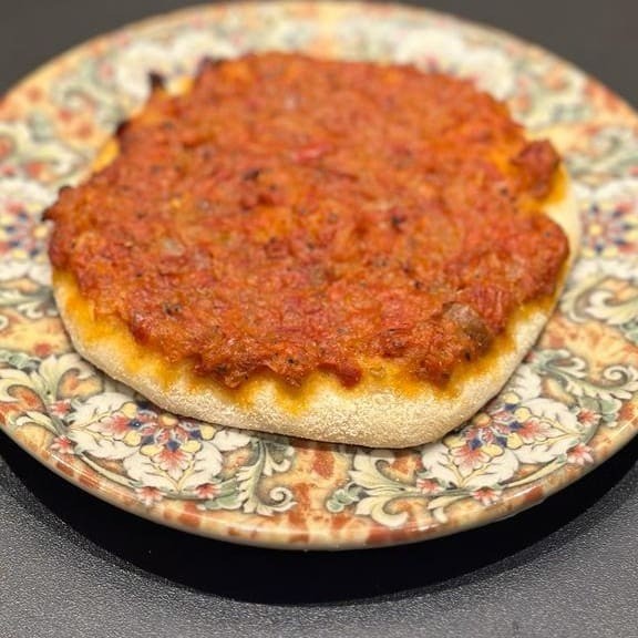 Recheada com molho de pimentão vermelho, tomate, cebola, queijo fresco e temperos sírios.