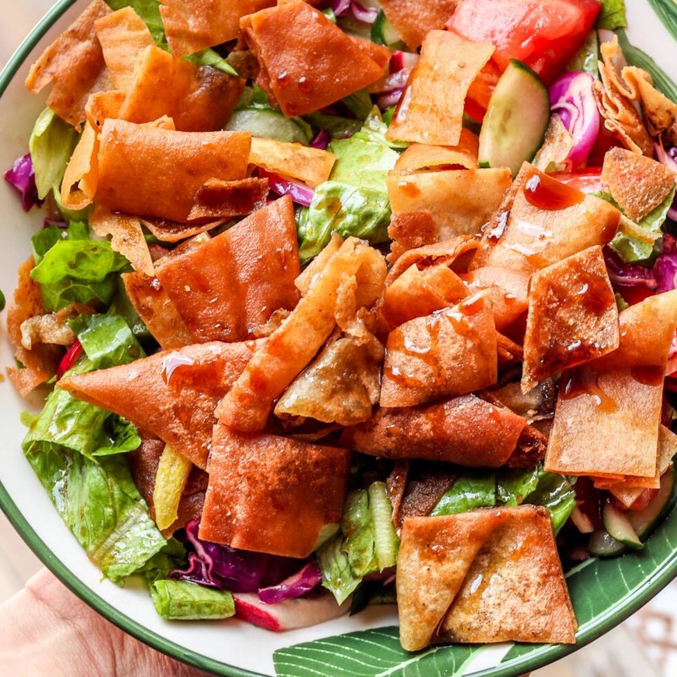 Uma salada refrescante e vibrante com alface crocante, tomate suculento, pepino fresco, cenoura doce, cebola picante, rabanete apimentado e hortelã aromática. Acompanha torradinhas de pão sírio, tudo temperado com um sofisticado molho à base de romã.