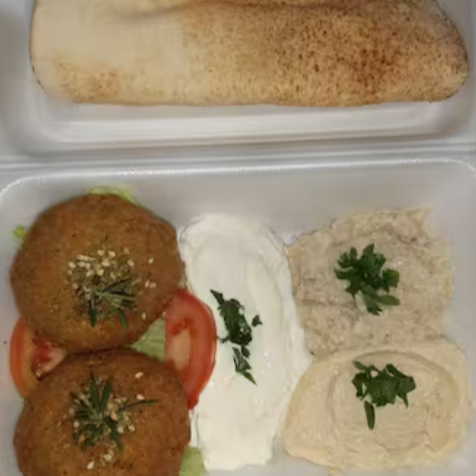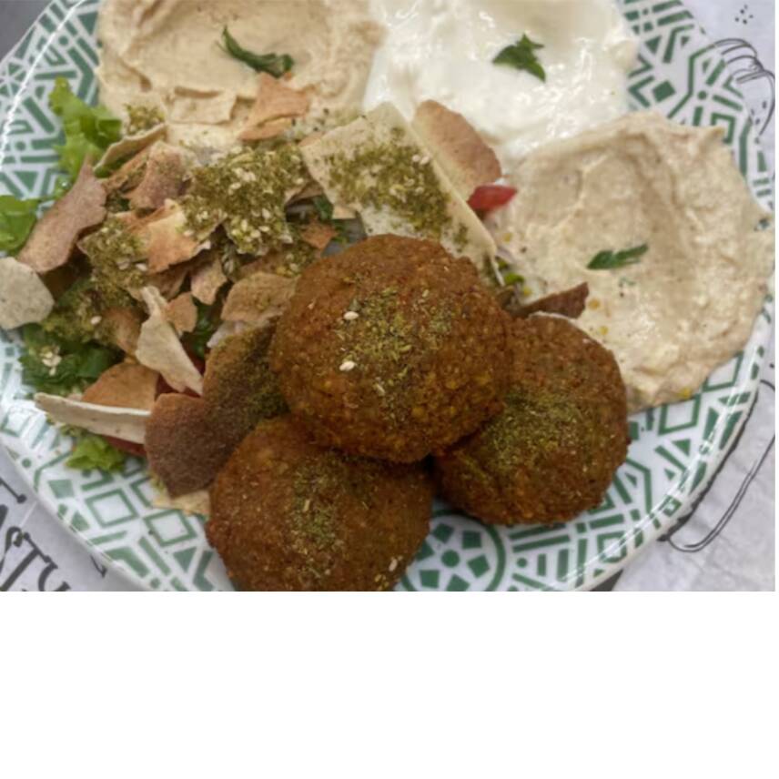 3 bolinhas de falafel, 140 gr de homus, 140 gr de coalhada seca, 140 gr de babaghanuj, salada fatuche ,01 pao sirio , molho tahine e 1 pão sírio.