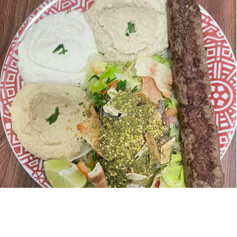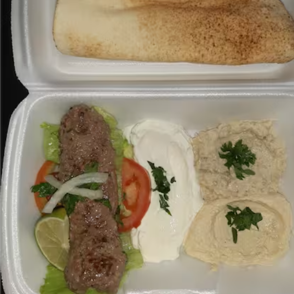 1 espeto de kafta, 140 gr de homus, 140 gr de coalhada seca,140 gr de babaghanuj, salada fatuche, 01 pão sírio.
