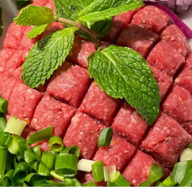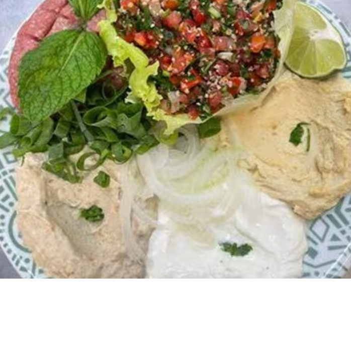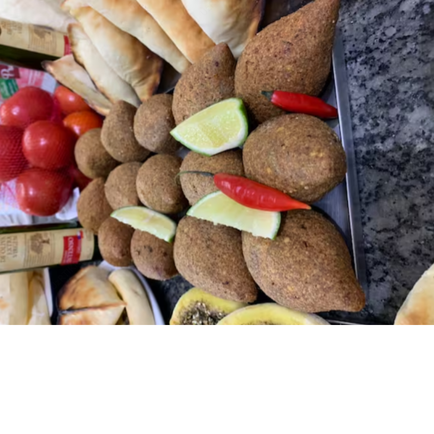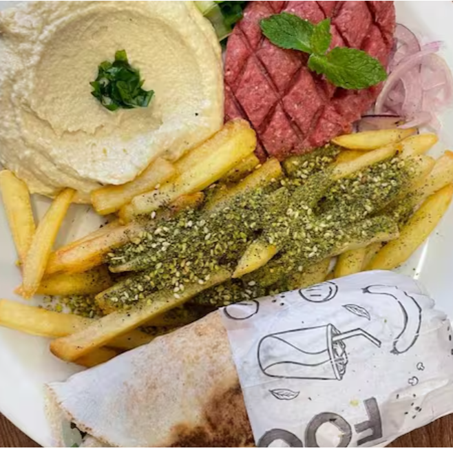 Mini sanduíche de sujok , 130 gr de Kibe cru ,130 gr de humos , 130 gr de batata frita com zataar , 01 pao sirio .