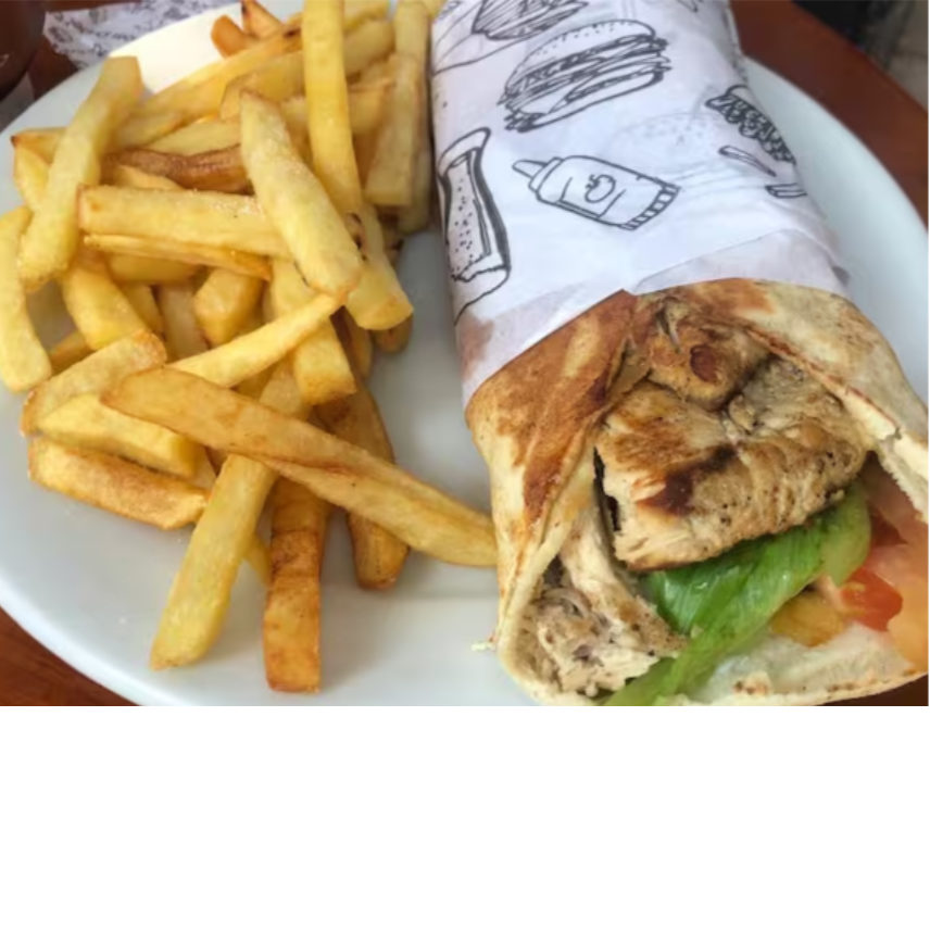 file de frango grelhado e fatiado no pao sirio grande , pasta de alho ,tomate fatiado , alface americana, acompanha 160 gr de batata frita .