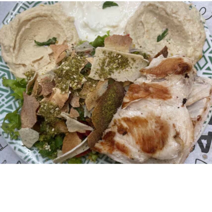 1 file de frango grelhado ,140 gr de homus, 140 gr de coalhada seca, 140 gr de babaghanuj, salada fatuche, pasta de alho e 1 pão sírio.