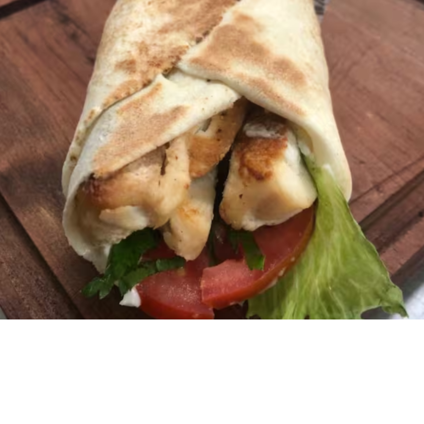 01 file de frango grelhado e fatiado no pao sirio grande , pasta de alho , tomate fatiado , alface americana .