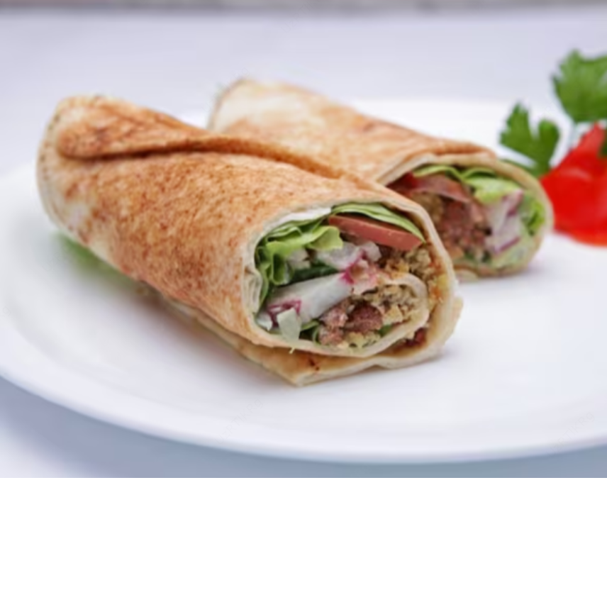 01 espeto de kafta no pao sirio grande , homus , tomate fatiado , cebola roxa fatiada , salasa picada .