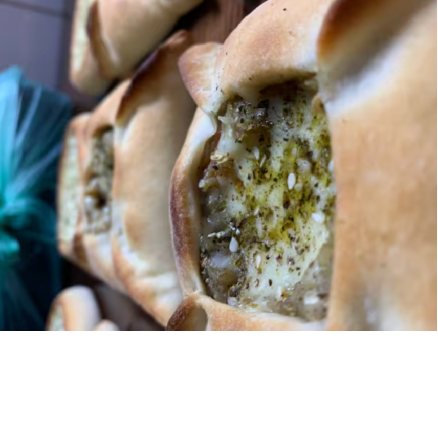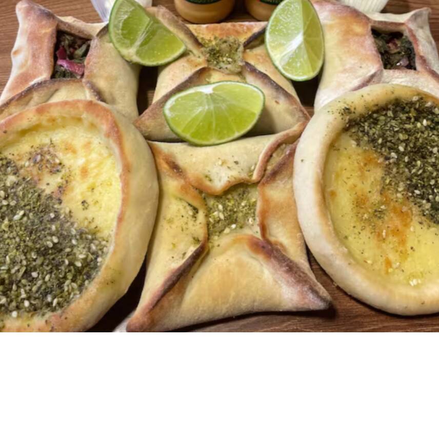 02 esfihas de queijo e zataar , 02 esfihas de berinjela defumada , 02 esfihas de espinafre a moda da casa .