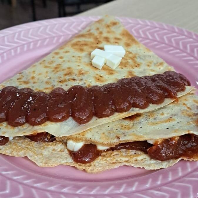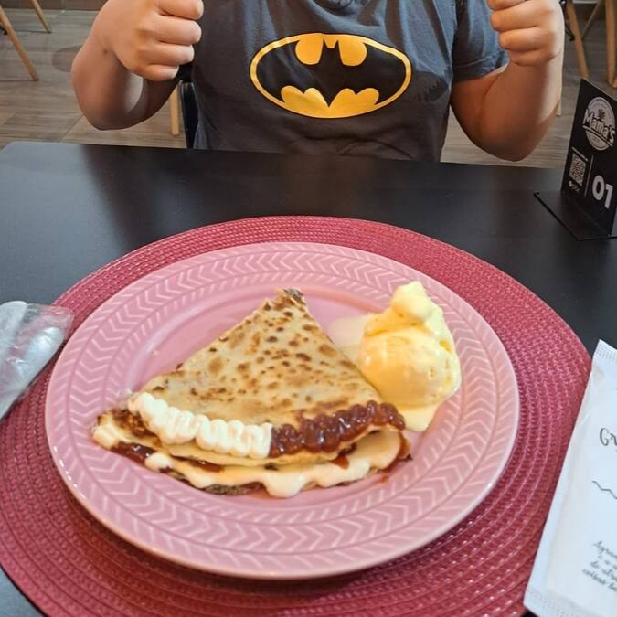 O 'Crepe Francês de Romeu e Julieta com Cream Cheese' é um Crepe Francês Doce que vai encantar o seu paladar. Este magnífico crepe é composto pela união harmoniosa e adorável do delicioso Cream Cheese e da Goiabada Cremosa, resultando em um recheio incrivelmente suave e delicioso. A goiabada cremosa acrescenta um toque doce e frutado que contrasta perfeitamente com a cremosidade do cream cheese. É uma experiência de sabor verdadeiramente sublime que irá transportá-lo diretamente para as ruas românticas de Paris. Experimente e se apaixone por este clássico da culinária francesa reinventado com um toque brasileiro.
