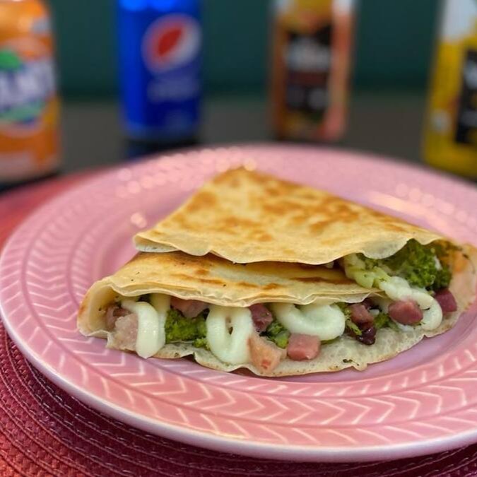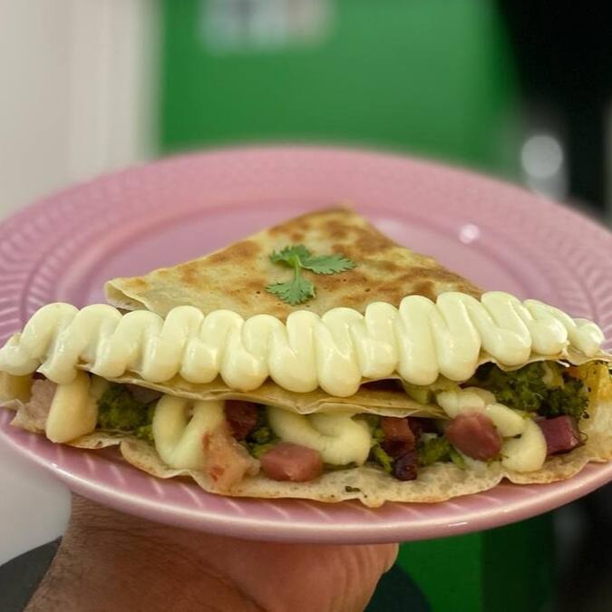 Apresentamos o 'Francês Brócolis', uma refinada opção de nosso menu de Crepes Franceses Salgados. Este crepe cuidadosamente recheado ostenta porções generosas de brócolis frescos, combinadas harmoniosamente com a cremosidade do Catupiry e realçadas pelo sabor marcante de cubos de bacon crocantes. Prepare-se para experimentar uma delícia inigualável em cada mordida do seu crepe.