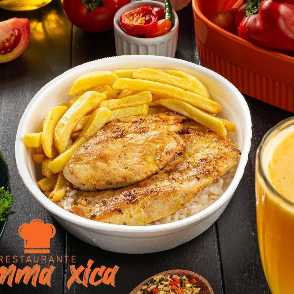 Marmitex de 750grs com File de Frango, Feijao, Arroz e Fritas
