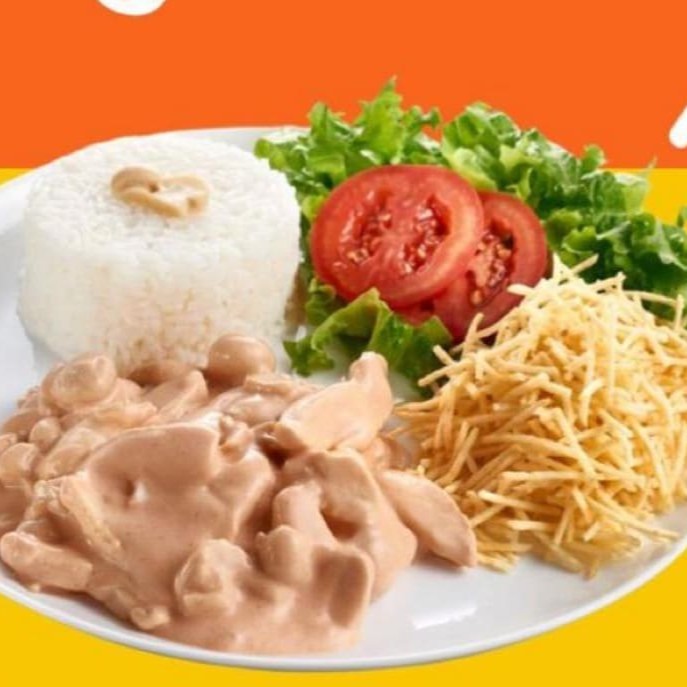 Delicie-se com nosso Strogonoff de Frango, servido em uma generosa marmitex de 750g. Este clássico da culinária é preparado com frango macio, mergulhado em um molho cremoso e irresistível. Acompanha arroz branco soltinho e batata palha crocante, que adicionam uma textura incrível ao prato. Ideal para o seu almoço! Nota: a alface é ilustrativa, caso queira este acompanhamento, solicite à parte. #al