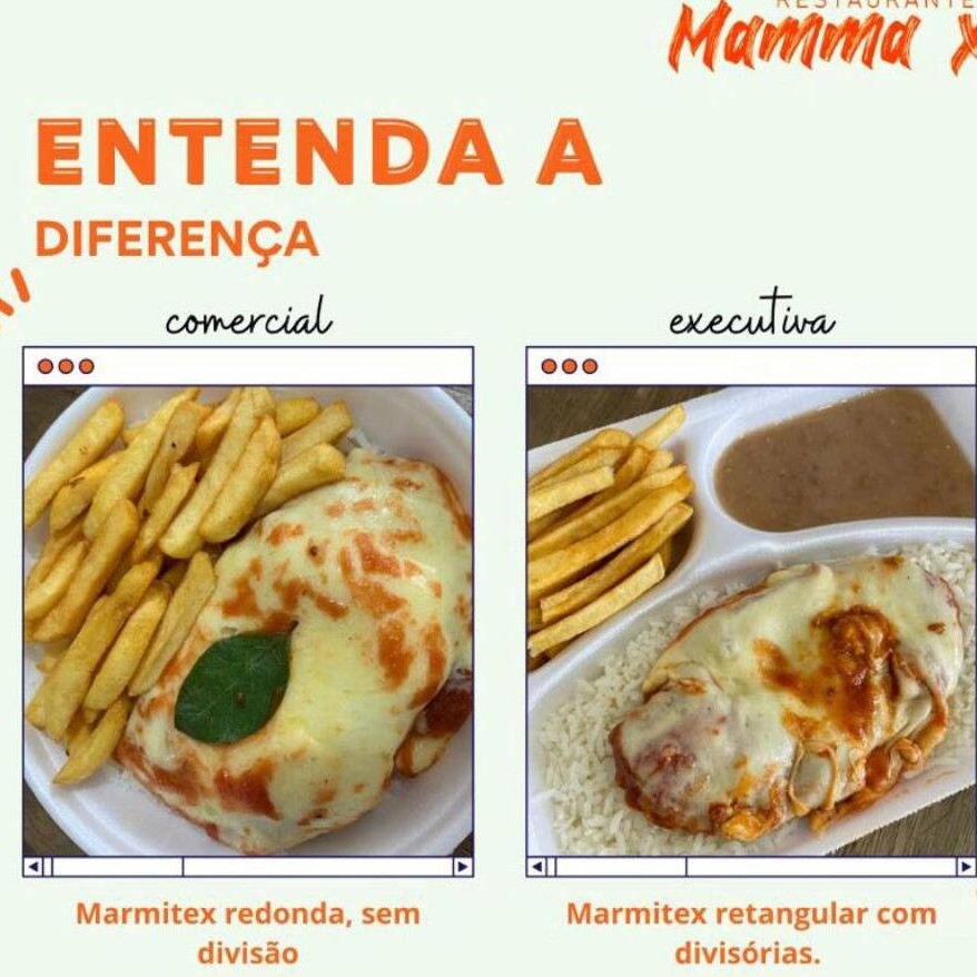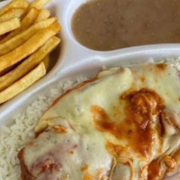 Marmitex de 750grs com Parmegiana de Frango, Feijao, Arroz e Fritas.