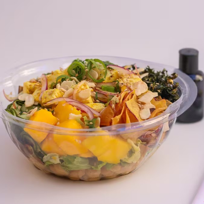Grão de bico, mix de folhas, edamame, sunomono, manga, chips de batata doce, couve crispy, tofu orgânico, amêndoas, cebolinha, gergelim e cebola roxa. Acompanha molho ponzu.