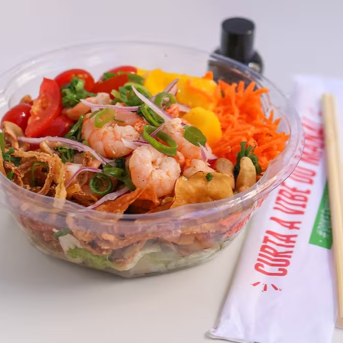 Espaguete de abobrinha, mix de folhas, abacaxi, cenoura, sunomono, chips de mandioca, chips de batata-doce, frango desfiado, amendoim, cebola roxa, cebolinha e gergelim. Acompanha molho shoyo.