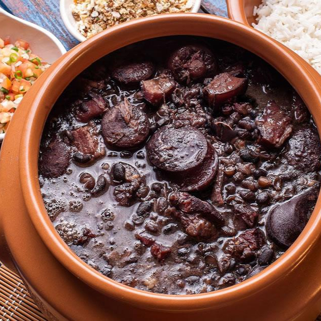 Feijoada com carne seca, costelinha e linguiça paio. Acompanha arroz branco, couve refogada e farofa.