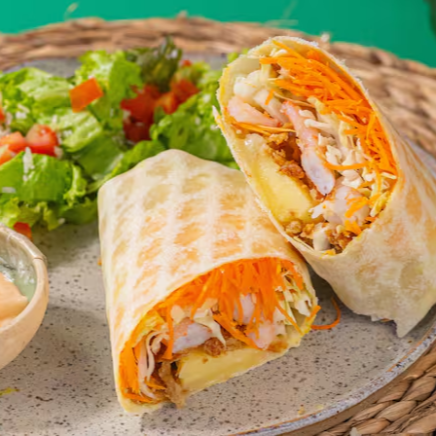 Camarão pré cozido, repolho, cenoura ralada e uma explosão de crocância com cebola crispy com queijo mussarela derretido. Tudo isso envolto em uma tortilha leve, acompanhado de um molho spicy de arrasar!