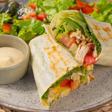 Frango suculento em tiras, abacaxi grelhado e alface americana. Finalizado com cenoura ralada e queijo mussarela, tudo envolto em uma tortilha leve e acompanhado do molho de mostarda e mel.