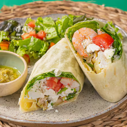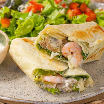 Camarão grelhado, alface americana crocante, croutons e espaguete de legumes. Enrolado em uma tortilha e finalizado com queijo parmesão. Acompanha o irresistível molho caesar mango.