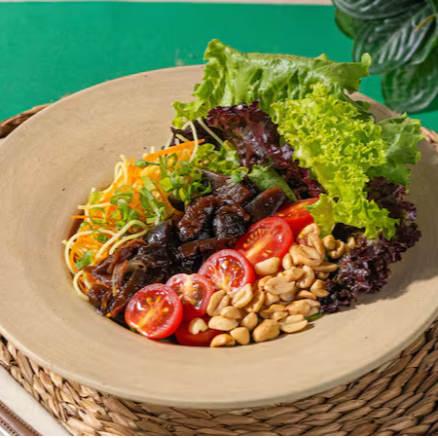Shitake refogado e saboroso, acompanhado de macarrão bifum, espaguete de legumes, amendoim torrado e tomate cereja. Finalizada com cebolinho fresco e acompanhada de molho teriyaki especial. Vegano e delicioso!