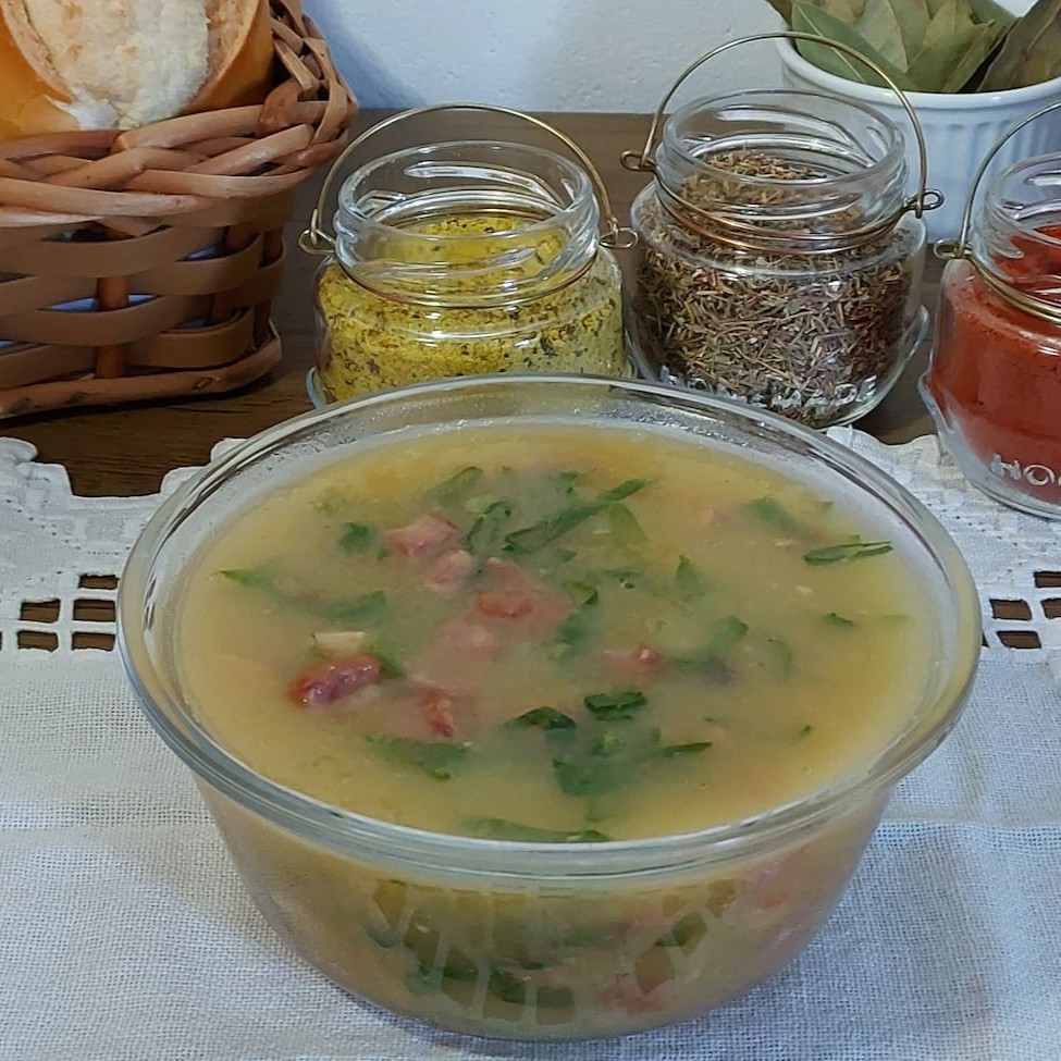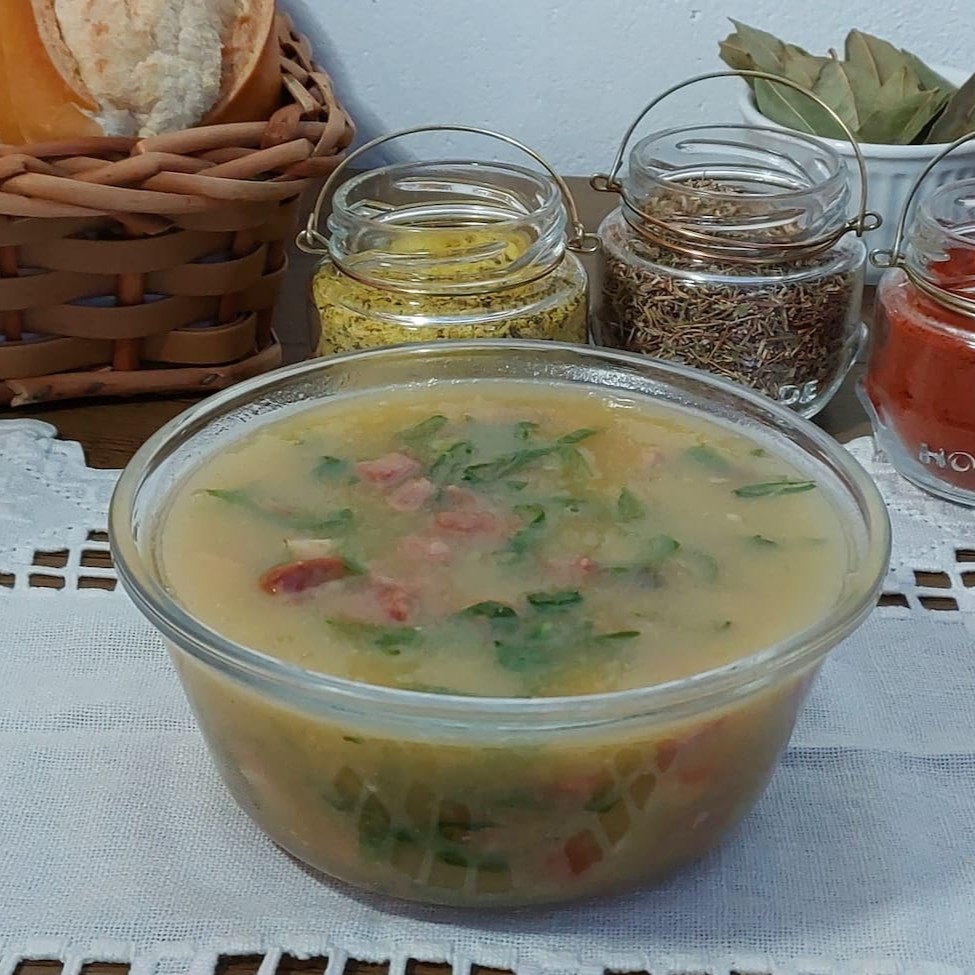 Caldo a base de mandioca com couve manteiga, calabresa picada e bacon picado refogado e temperos caseiros !!!Atenção Não Fazemos Alterações Em Nossas Receitas!!!